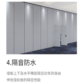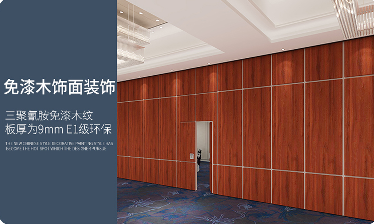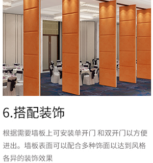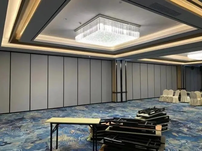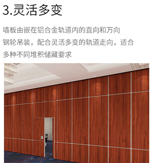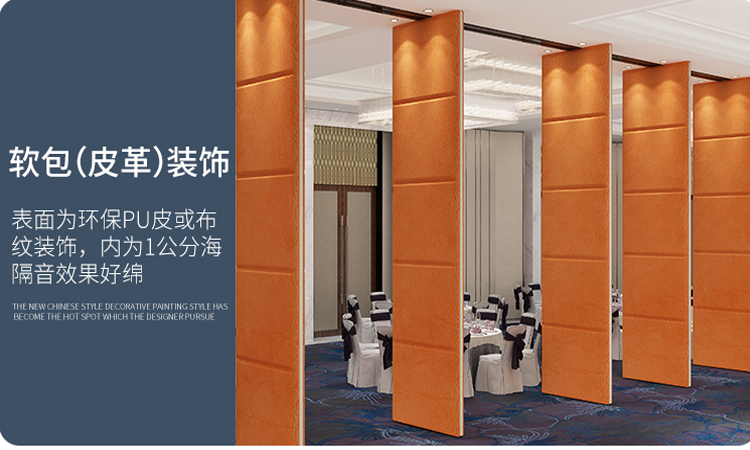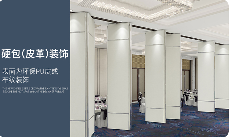 酒店移动隔断墙一般是通过吊轮顶部悬挂于天花板上,在内部结构中方便安装,工人进行电缆铺设,无需打墙洞埋线缆,后期也方便线缆...
