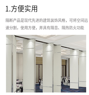多功能厅移动隔断墙可以形成一些小区域,使空间有层次感,从而满足应用需求。它可以随时将多功能厅分为小宴会厅、中宴会厅和大宴会厅。划分这些区域后,可以使所有的空间具有多样化的功能,进而适应人们对不同就餐开会环境的需求。