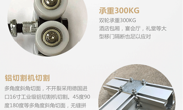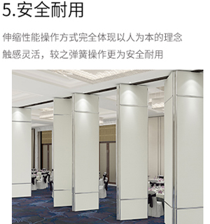 活动隔断屏风收展自如,推动灵活,一个人可完成隔断整个使用过程。POM粒子滑轮配合高强度铝合金道轨,使门板推动轻便、噪音小,适应各种灵活多变空间走向,适合多种不同空间需求。
